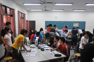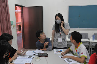 第三小隊柯恩、敦毅、翊馨在等待觀察水中微生物